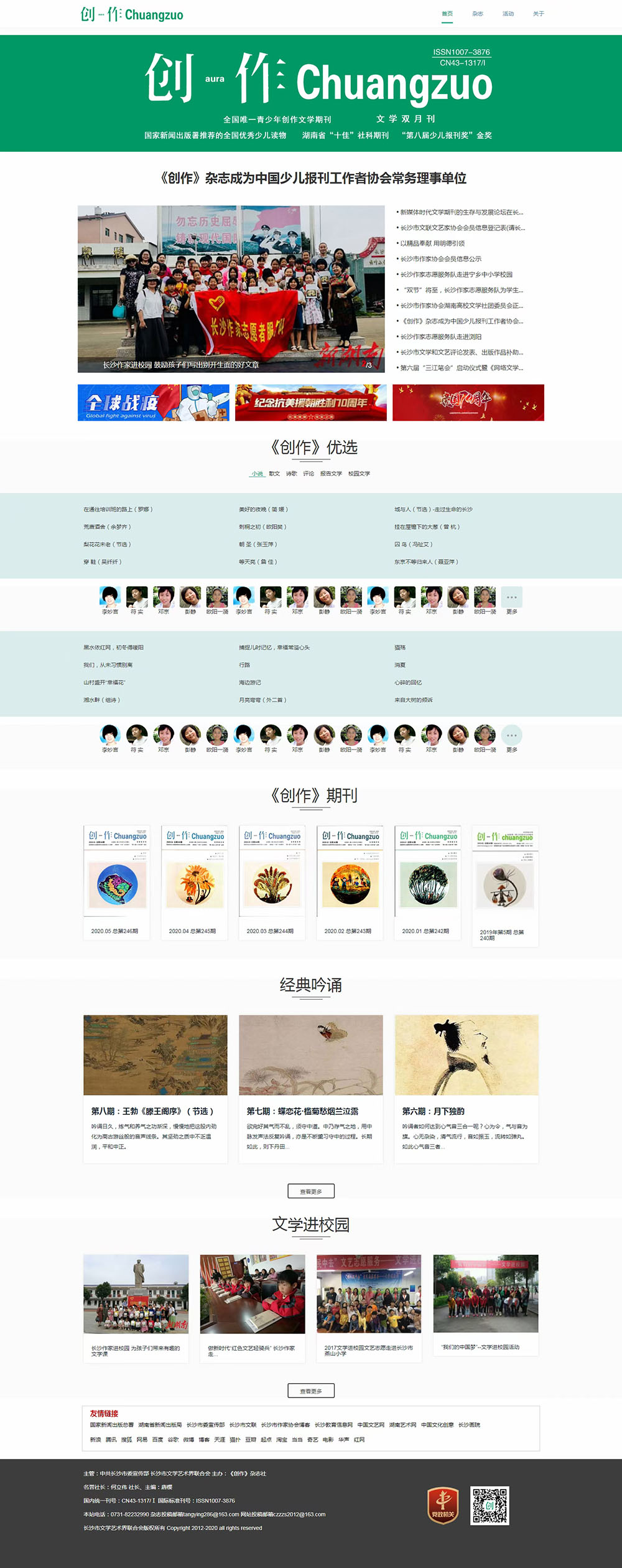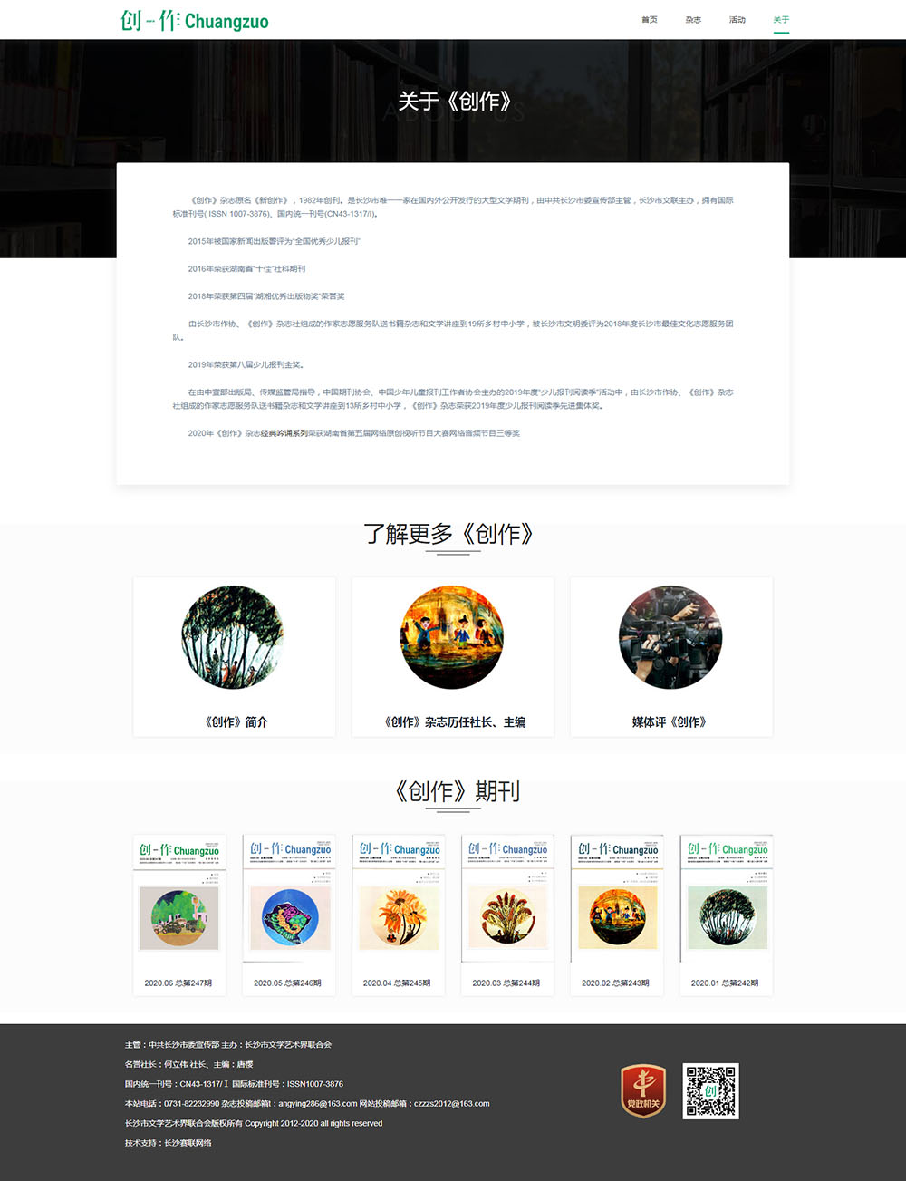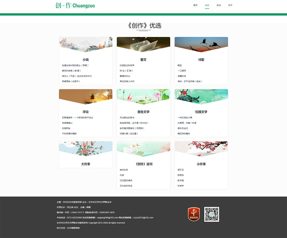 《創(chuàng)作》雜志原名《新創(chuàng)作》,1982年創(chuàng)刊。是一家在國內(nèi)外公開發(fā)行的大型文學期刊,由中共長沙市委宣傳部主管,長沙市文聯(lián)主辦,擁有國際標準刊號( ISSN 1007-3876)、國內(nèi)統(tǒng)一刊號(CN43-1317/I)。2015年被國家新聞出版署評為“全國優(yōu)秀少兒報刊”?2016年榮獲湖南省“十佳”社科期刊?2018年榮獲第四屆“湖湘優(yōu)秀出版物獎”榮譽獎?由長沙市作協(xié)、《創(chuàng)作》雜志社組成的作家志愿服務隊送書籍雜志和文學講座到19所鄉(xiāng)村中小學,被長沙市文明委評為2018年度長沙市優(yōu) 秀文化志愿服務團隊。