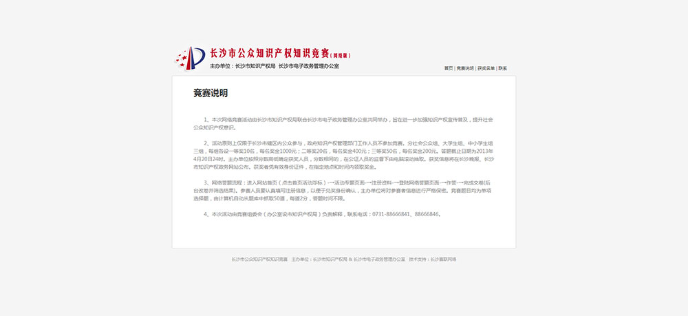 競賽說明 1、本次網(wǎng)絡(luò)競賽活動由長沙市知識產(chǎn)權(quán)局聯(lián)合長沙市電子政務(wù)管理辦公室共同舉辦,旨在進一步加強知識產(chǎn)權(quán)宣傳普及,提升社會公眾知識產(chǎn)權(quán)意識。 2、活動原則上僅限于長沙市轄區(qū)內(nèi)公眾參與,政府知識產(chǎn)權(quán)管理部門工作人員不參加競賽。分社會公眾組、大學(xué)生組、中小學(xué)生組三組,每組各設(shè)一等獎10名,每名獎金1000元;二等獎20名,每名獎金400元;三等獎50名,每名獎金200元。答題截止日期為2013年4月20日24時。主辦單位按照分?jǐn)?shù)高低確定獲獎人員,分?jǐn)?shù)相同的,在公證人員的監(jiān)督
